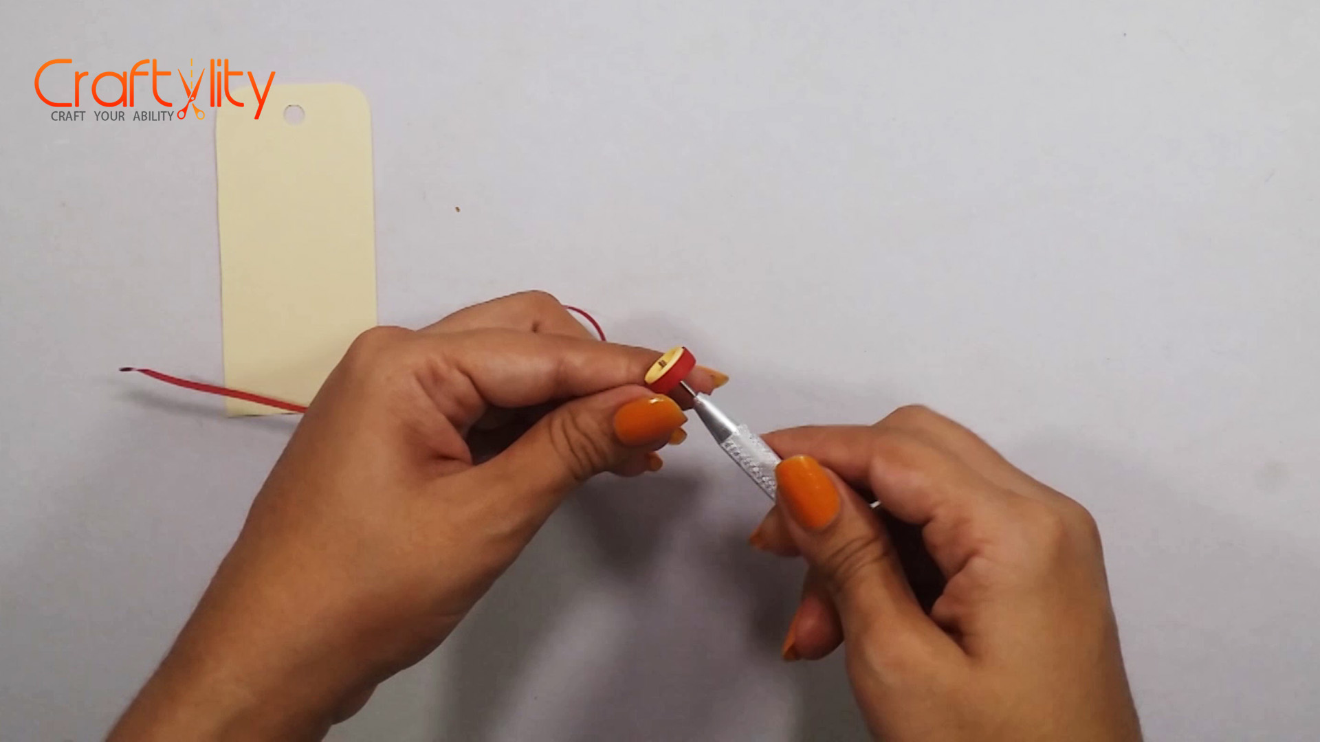 Stick all the elements on the tag and attach the ribbon to it.