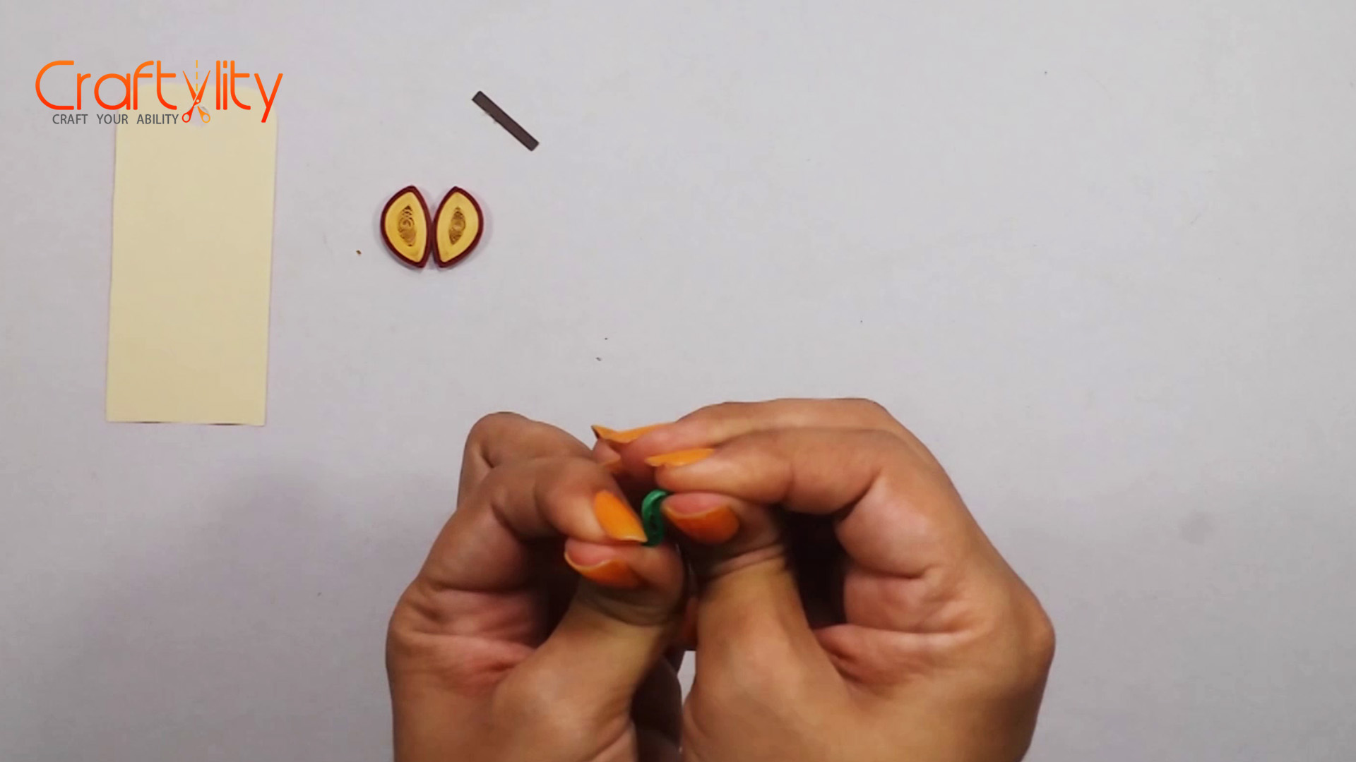 Take 3 mm of brown quilling strip of 3cm long. Take 3 mm of green quilling strips and roll it with slotted Tool take coil out from the tool and allowed it to enroll a little. Hold the coil from both the hand and pinch it from both side and bend it in opposite directions to create “S” like shape.