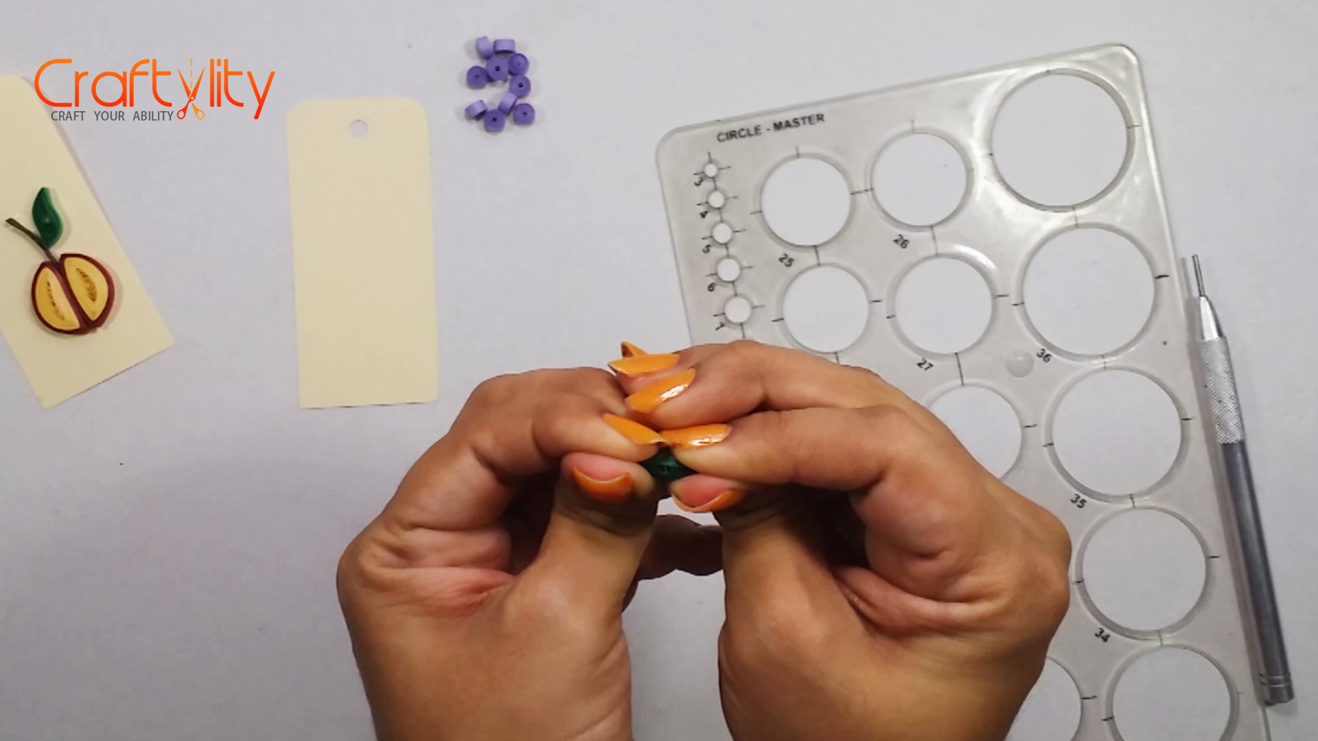 To create leaf, take 3mm green strip and roll it. Take the coil out from the tool and place the coil in circle guide. Take the coil out form circle and hold the coil from both the hands and pinch it from both sides to create Marquise shape.